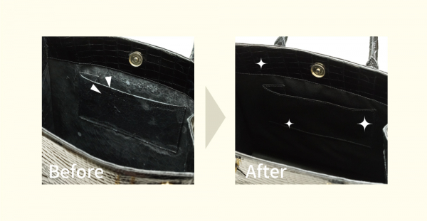 当店では、バッグ用の布地(シャンタン生地)を使用し、内側の袋の作り直しや貼り替えを行います。中にあるファスナーやポケット、ブランドタグなども元どおり付け直しいたします。